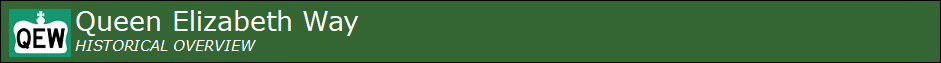 SOURCES: "Toronto-Hamilton Highway," The Toronto Star (9/28/1914); "Queen Honored As Road Named," The Globe and Mail (6/08/1939); "Middle Road 'Going to Pieces,' Government Will Spend $500,000" by Ralph Hyman, The Globe and Mail (9/07/1945); "$57 Million for Roads, but Cement Lack Halts Ontario Paving Program," The Globe and Mail (8/19/1948); "Half-Billion for Roads Five-Year Plan, Pave Barrie 4-Lane in 1950," The Toronto Star (2/23/1950); "Squaring Off Dixie Road Is Welcomed by Residents, The Toronto Star (3/10/1951); "Hope To Cut Death Toll on Queen Elizabeth Way by Dixie Road Overpass" by Dennis Braithwaite, The Toronto Star (12/05/1952); "New Housing Developments Near Dixie Seen Making Queen Elizabeth Highway Traffic Heavier Than Ever," The Toronto Star (5/14/1953); "Oakville-Clarkson Promised $2,000,000 Road Improvement," The Toronto Star (9/30/1954); "For a Safer QE Way," The Toronto Star (10/26/1955); "Will Close 22 Roads While QEW Is Widened," The Toronto Star (9/19/1957); "Approve Bid To End QEW Intersections," The Globe and Mail (12/09/1959); "Expressway Seen Ready Next Fall," The Hamilton Spectator (1/08/1960); "Skyway Over Welland Canal To Cost $17 Million," The Globe and Mail (1/11/1960); "Award QEW Widening Contract," The Toronto Star (7/18/1961); "New York State Offers Much to the After-Labour Day Traveller," The Toronto Star (9/15/1962); "Four More Years of That QEW-27 Headache," The Toronto Star (9/17/1968); "$164.1 Million Slated for Highways in 1969," The Globe and Mail (4/03/1969); "QEW Circle Out by 1972," The Hamilton Spectator (5/25/1971); "The End of a Circle," The Globe and Mail (4/30/1975); "The Quick and Easy Way? Forget It!" by Stewart Brown, The Hamilton Spectator (1/21/1978); "Proposal Studied for New Skyway To Ease QEW Jams," The Globe and Mail (12/12/1980); "Report Not Final Word on Bridge, Official Says," The Globe and Mail (5/28/1981); QEW: Canada's First Superhighway by Robert M. Stamp, The Boston Mills Press (1983); "Bridge 'Christened' by Accident Minutes After Official Opening," The Toronto Star (10/12/1985); "403 Link, QEW Widening Will Mean 5,700 Jobs," The Hamilton Spectator (2/11/1993); "More Carpooling Lanes Coming to Golden Horseshoe," CBC News (5/24/2007); "QEW Next In Line For HOV Lanes," CITY-TV (8/14/2007); "QEW Widening Closer to Reality," Niagara This Week (1/23/2008); "QEW Toll Lanes Were Met With Strong Demand, but Will It Last?" by Oliver Moore, The Globe and Mail (8/26/2016); "Roads and Highways" by C.W. Gilchrist, The Canadian Encyclopedia (2021); "Ontario's First 'Diverging Diamond' Interchange Opens Today" by Kyle Hocking, CITY-TV (9/23/2022); "Toronto and Ontario Agree to New Deal, including DVP, Gardiner, and Ontario Place" by Isaac Callan and Colin D'Mello, CIII-TV (11/27/2023); "Ontario Targets 2026 Start Date for Skyway Twinning Project in St. Catharines" by Don Mitchell, CIII-TV (4/05/2024); "$314M Highway Bridge Construction Project Continues in Mississauga" by Declan Finucane, Insauga.com; "NOTL Agrees to Details of Twinning Skyway" by Kris Dube, The Niagara-on-the-Lake Local (5/29/2025); Infrastructure Ontario; The Miller Group; WT Partnership; Cameron Bevers; Scott Steeves; Jody Thornton.