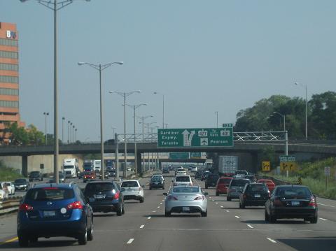 This 2013 photo shows the Toronto-bound Queen Elizabeth Way approaching Highway 427 in Mississauga. The Gardiner Expressway continues the route of Queen Elizabeth Way into Downtown Toronto. (Photo by Steve Anderson.)