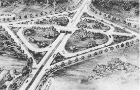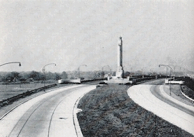 Still missing was a direct highway connection to the Peace Bridge at Fort Erie, which had been long promised since the completion of the bridge in 1927 as part of the original Niagara Parkway plan. In 1939, the province built a large traffic circle, along with a five-acre park (Mather Park) and Memorial Gateway, that was designed to connect the Peace Bridge with the QEW.