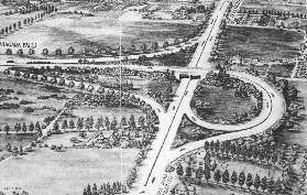 AN EXTENSION TO NIAGARA: Included in McQuesten's plan was an extension called "New Niagara Parkway" that was to continue the Middle Road highway to the Niagara region. The New Niagara Parkway incorporated a modified version McQuesten's original 1927 Niagara parkway plan to connect the Peace Bridge and Honeymoon Bridge; the updated proposal had the Peace Bridge as its southern terminus. Unlike the Middle Road alignment from Toronto to Hamilton, which was to be built in part through developed areas with limited right-of-way availability, the Niagara Parkway alignment from Hamilton to the Niagara region was to be built mostly through farmland, allowing for greater right-of-way availability.