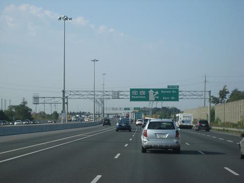 QEW and ON 403 shields by Cameron Bevers. Gardiner Expressway shield by James Alcock. Speed limit sign from Wikipedia. Lightpost photos by Steve Anderson.