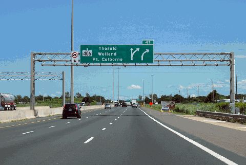 CHANGES FOR INTERCHANGES: The 1980s also featured construction of a key, long-delayed freeway-to-freeway connection. In 1984, the MTO opened a new trumpet interchange (EXIT 49) in St. Catharines for Highway 406 after three years of construction. Planned since the 1960s, Highway 406 provides a north-south link linking St. Catharines with industrial areas along the Welland Canal.