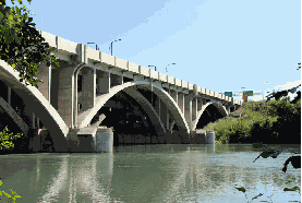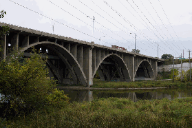 Two iconic open-spandrel concrete arch bridges were built along the Queen Elizabeth Way at St. Catharines (left photo, taken in 2011) and Port Credit (right photo, taken in 2014). The Port Credit bridge photo was taken several years before significant reconstruction took place at this location. (Photos by Scott Steeves, www.asphaltplanet.ca.)
